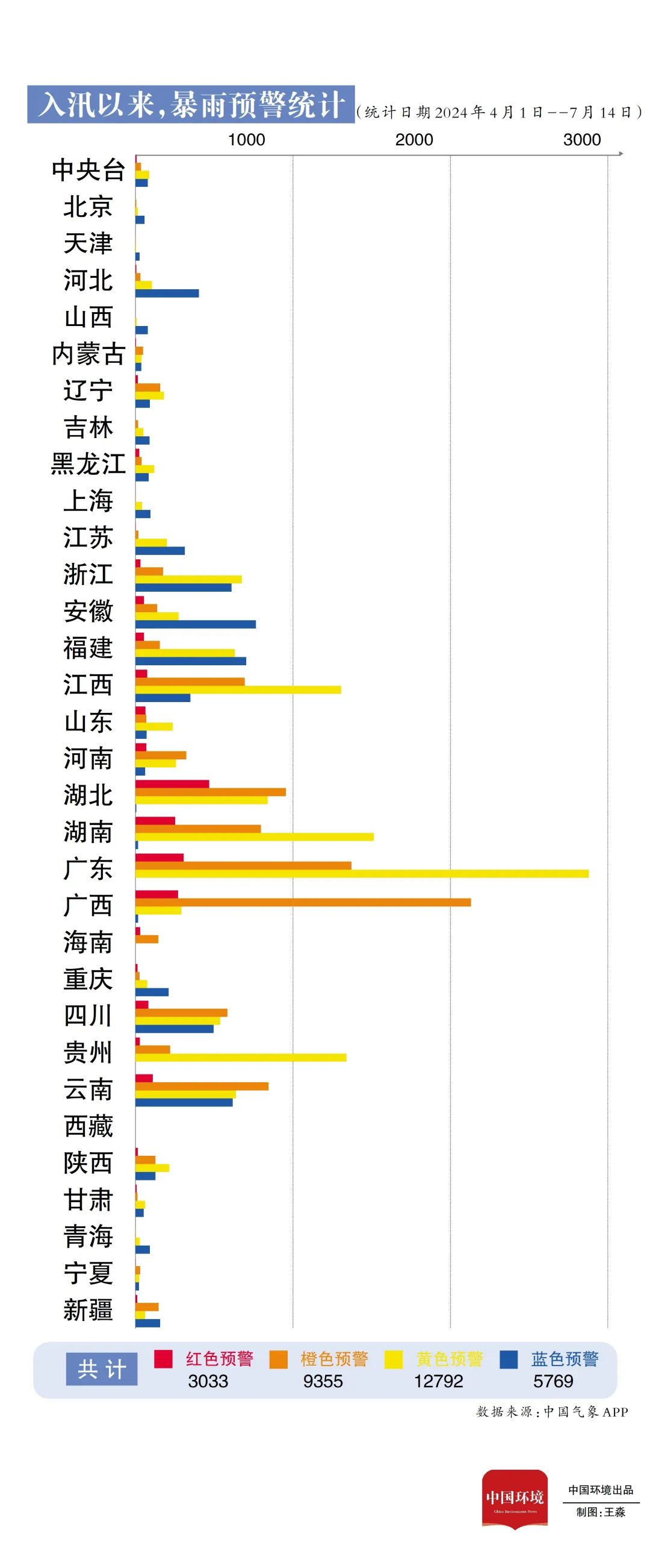 记者梳理发现,4月1日入汛以来,全国发布气象预警信息16万条,其中暴雨预警气象灾害预警信息达到3万余条,占比18.83%。据统计,截至7月14日,中央气象台共计发布暴雨红色预警9次。从全国情况来看,广东发布暴雨预警信息4569条,湖北发布暴雨红色预警信息多达470条。